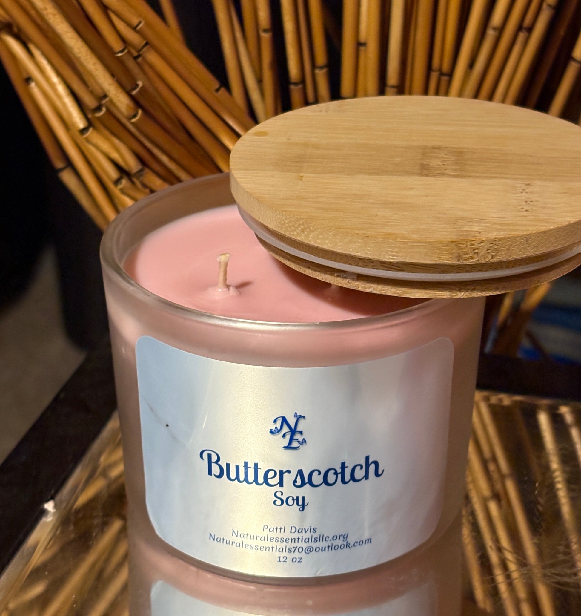 12 oz Soy. Each candle is hand-poured and crafted with pure soy wax for a clean and long-lasting burn. Fill your space with the warm and sweet scent of butterscotch.